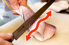 腹骨と、身の真ん中にある血合い骨を切り取れば、後は刺身に切り分けるだけ。あまり薄く切る必要はありません。ほどよい厚さで、アマダイの身の旨味と、弾力のある皮の歯応えを楽しみましょう。 |