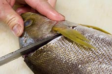 身を切り離す/その2 今度は腹側を切ります。腹ビレのすぐ近くに包丁の先を入れ、背中側のときと同様、中骨に沿って少しずつ切って行きます。身の片側を切り離したら、裏返して同様に反対側も切り離しましょう。 |