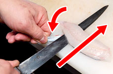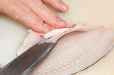 腹の身を削ぐようにして、腹骨を切り取ります。身の中央には、血合い骨があります。骨が並んでいる列に沿って身を半分に切り分け、血合い骨を切り取ります。 |