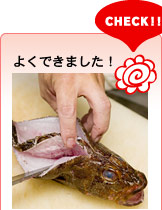 ひっくり返して、反対側も同様に切ります。今度は尾ビレから頭の方に、包丁を入れます。ここでも徐々に包丁を入れるのがコツです。 |
