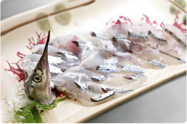 身を薄く切れば、刺身の完成です。身が透き通るように美しく淡白な味わいのサヨリの身は、日本酒に良く合います。醤油にレモンや山椒を混ぜると、より一層美味しくなります。