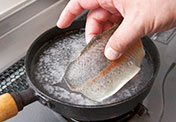 フライパンに水と酒、塩を入れ火にかける。沸騰したらニジマスの身の方から入れ、弱火にする。