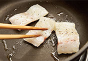 フライパンに少量のサラダ油を引き、弱めの中火で熱し、塩・コショウした皮つきのスズキの皮目を押し付けるように焼き、のち全体に火が通るように軽く押さえながら焼く。